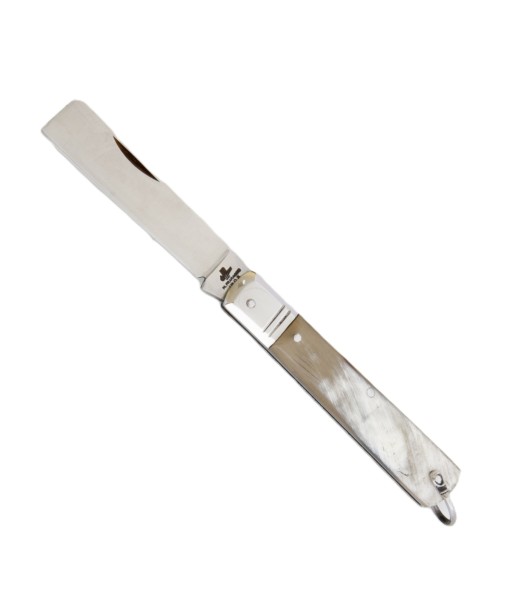 Il manico realizzato in corno lucido presenta una parte terminale dalla forma ricurva ed una testina inox tra manico e lama.